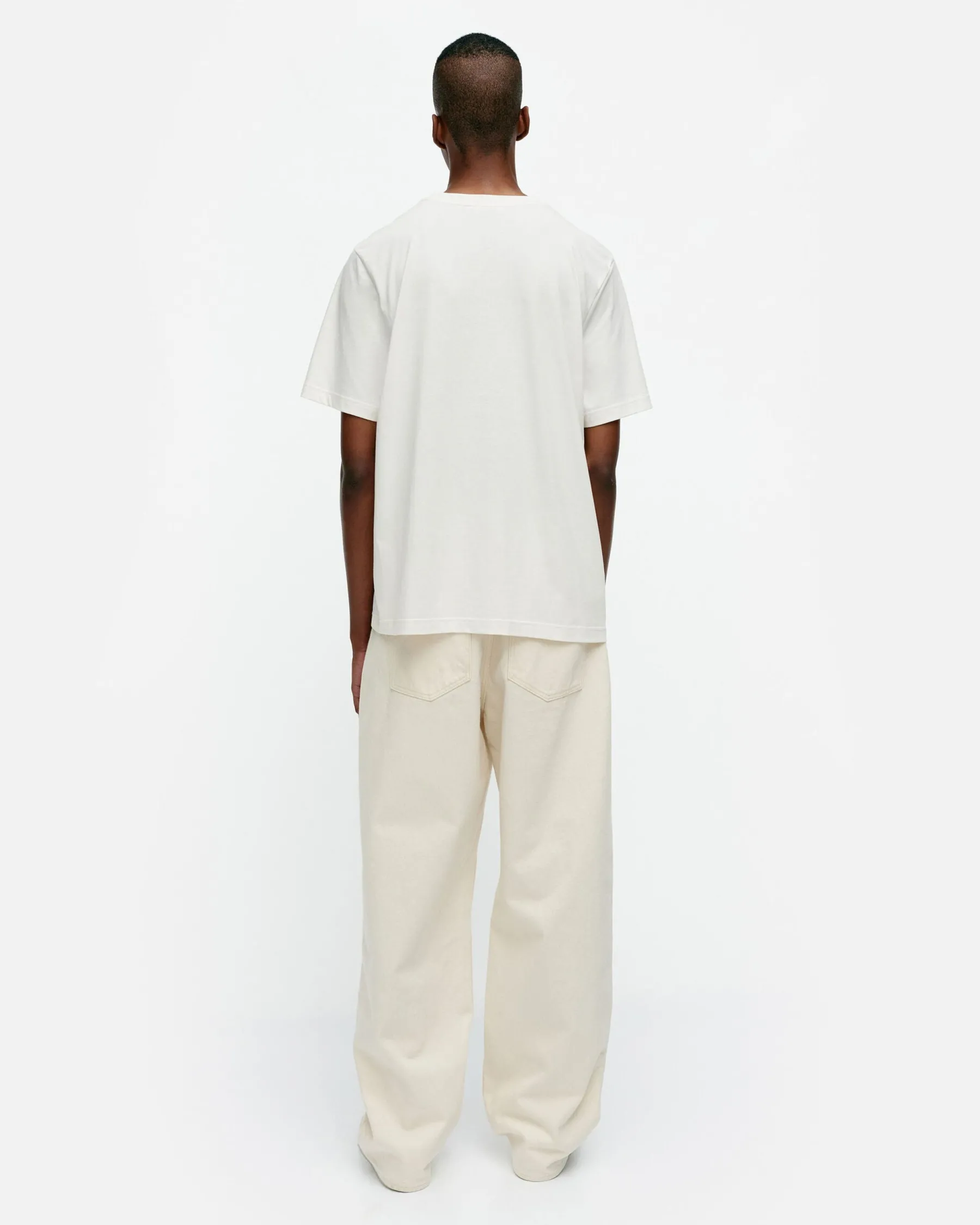 Embla-T-Paita On Valmistettu Luomupuuvillatrikoosta Ja Siinä On Miesten Mitoitus. T-Paidassa On Resori Pyöreässä Pääntiessä Ja Kappalepainettu Unikko-Kuosi Sekä Marimekon Printtiteksti Edessä.
