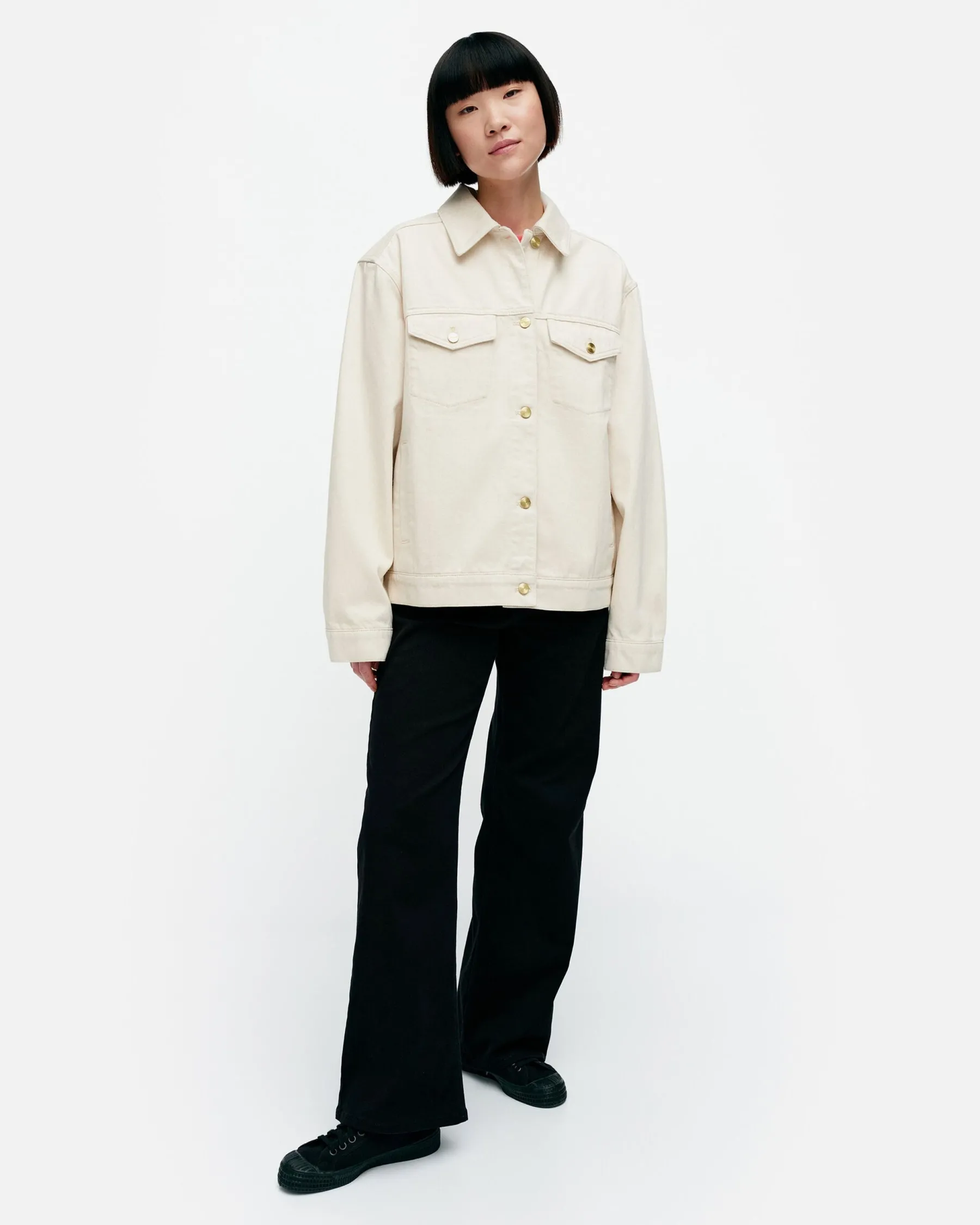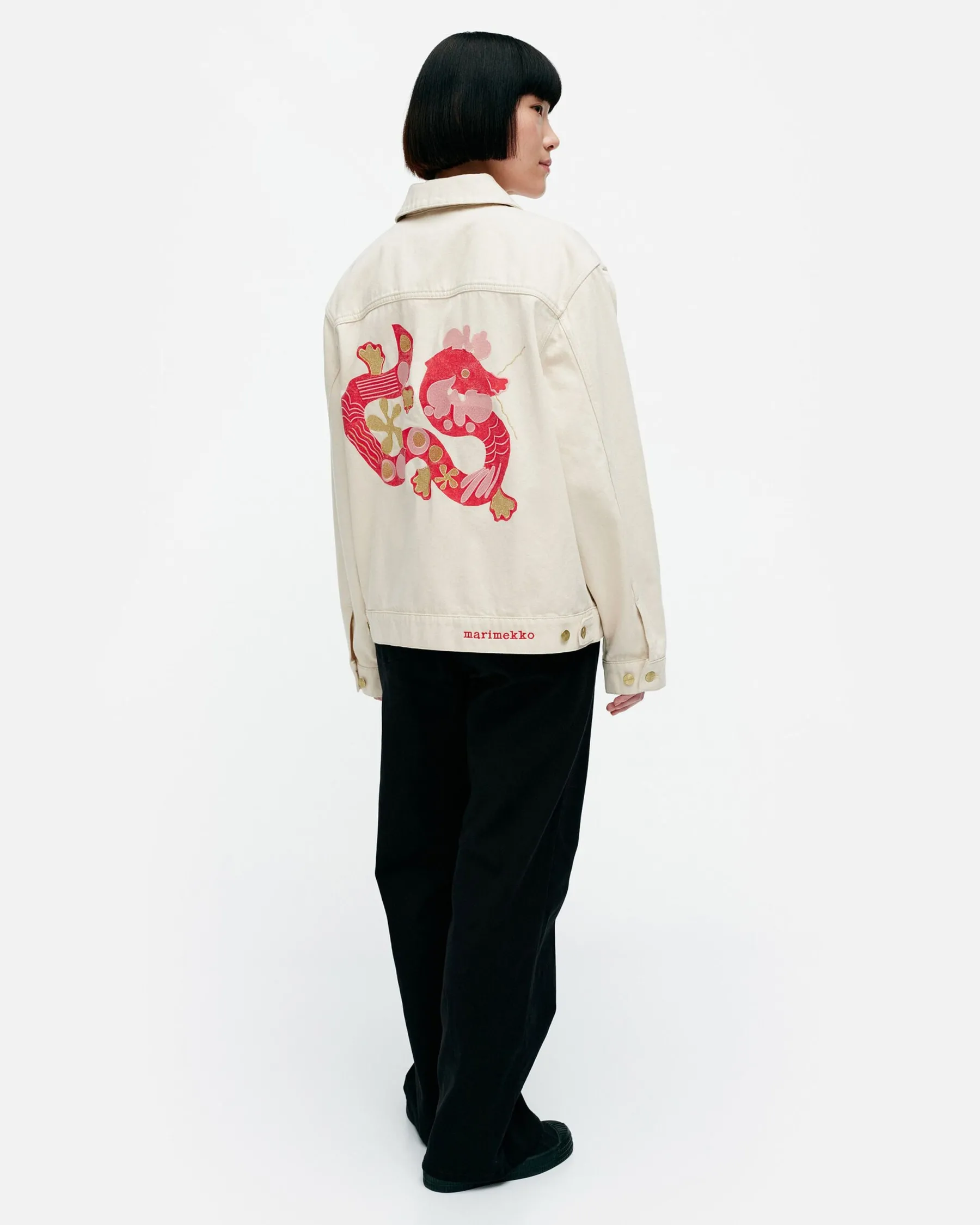 Ystävyys-Farkkutakki On Valmistettu Luomupuuvillatvillistä Ja Siinä On Väljä Istuvuus. Selkäpuolella On Osittain Painettu, Osittain Brodeerattu Jalo-Kuosi. Takissa On Nappilista, Läpälliset Rintataskut Nappisuljennalla, Listataskut Sivuilla Ja Takana Helmakaitaleessa Säädettävät Tampit. Hihansuissa On Rannekkeet Ja Nappisuljenta.Koko & Istuvuus