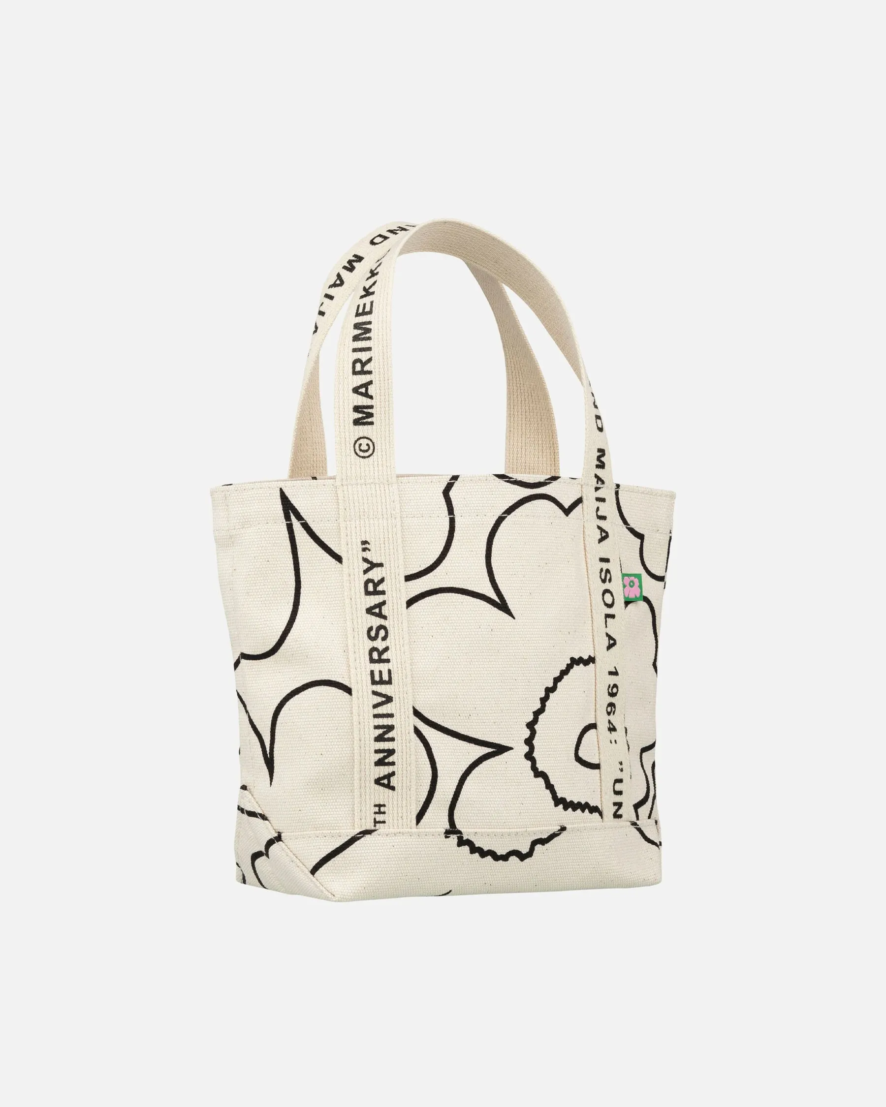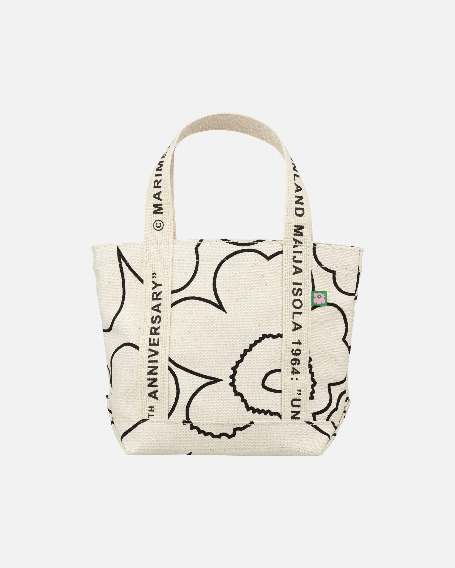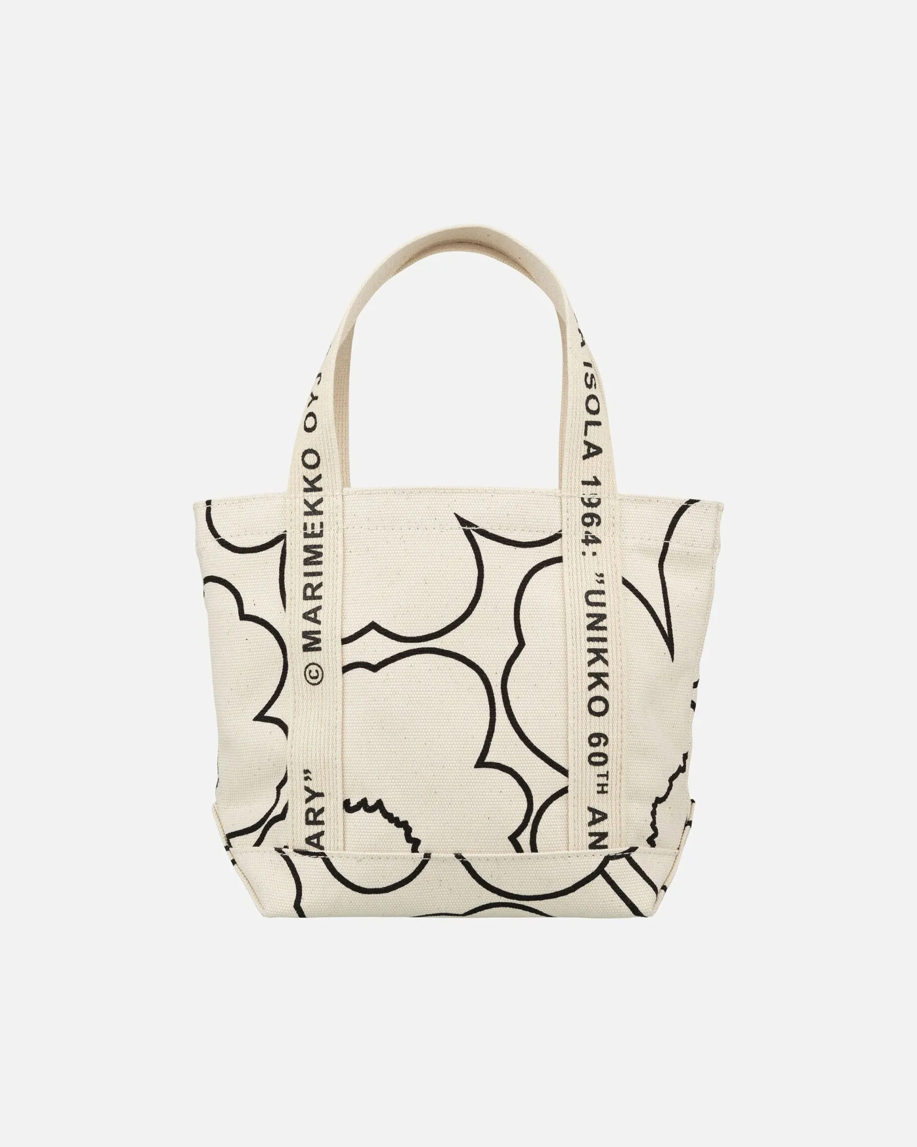 Carrier Mini -Laukku On Valmistettu Valkaisemattomasta, Piirto Unikko -Kuosisesta Puuvillapellavasta, Joka On Painettu Helsingissä. Marimekko Kioski -Tekstillä Painettu Puuvillanauha Kulkee Laukun Päällä Muodostaen Samalla Laukun Kantokahvat.