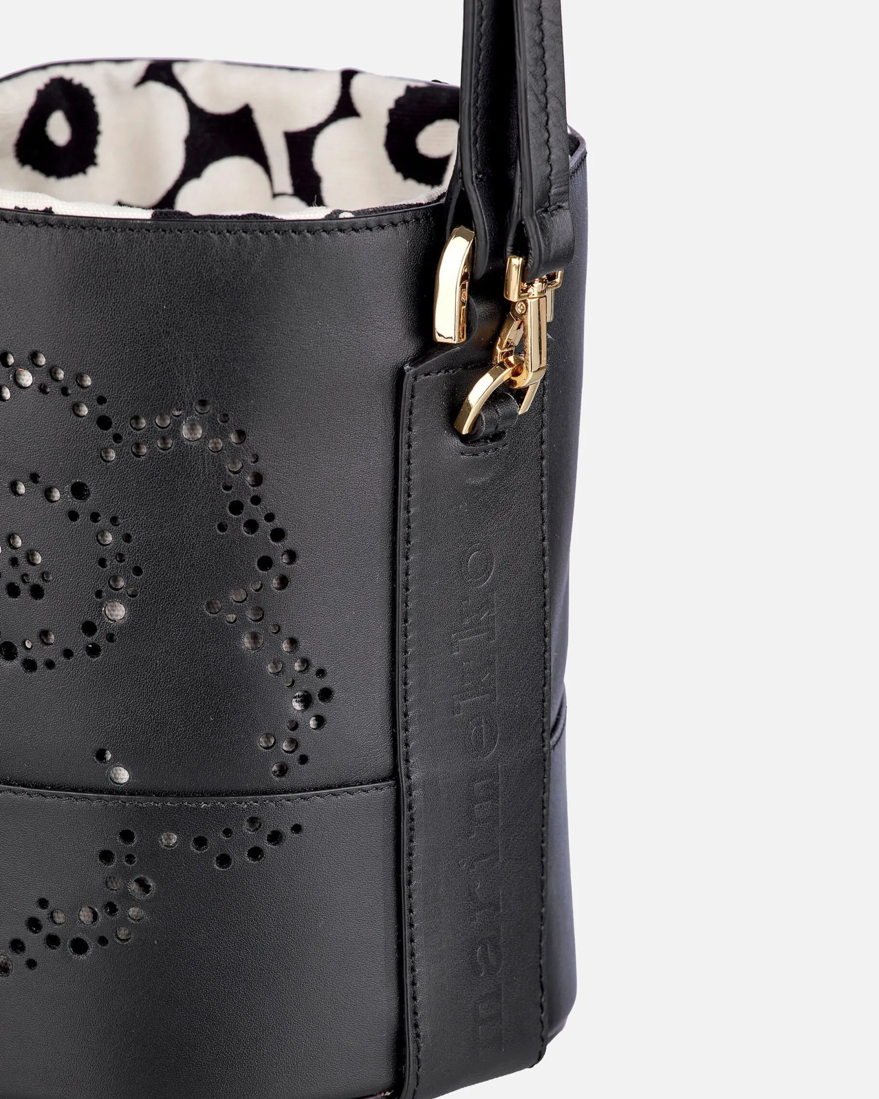 Imprint Small Bucket Unikko -Laukku On Valmistettu Jäljitettävästä Skandinaavisesta Nahasta. Etupuolen Unikko-Kukka Muodostuu Pitsimäisesti Pienistä Rei’Istä. Laukussa On Kantohihna Sekä Irrotettava Ja Säädettävä Olkahihna. Laukun Suuaukko Vedetään Kiinni Nahkahihnojen Avulla Ja Kiinnitetään Stopparilla. Laukussa On Yksi Sisätasku. Sisävuori On Valmistettu Unikko-Kuosisesta Puuvillasta. Marimekko-Logo On Kohokuvioitu Laukun Sivuihin Ja Pohjaan.