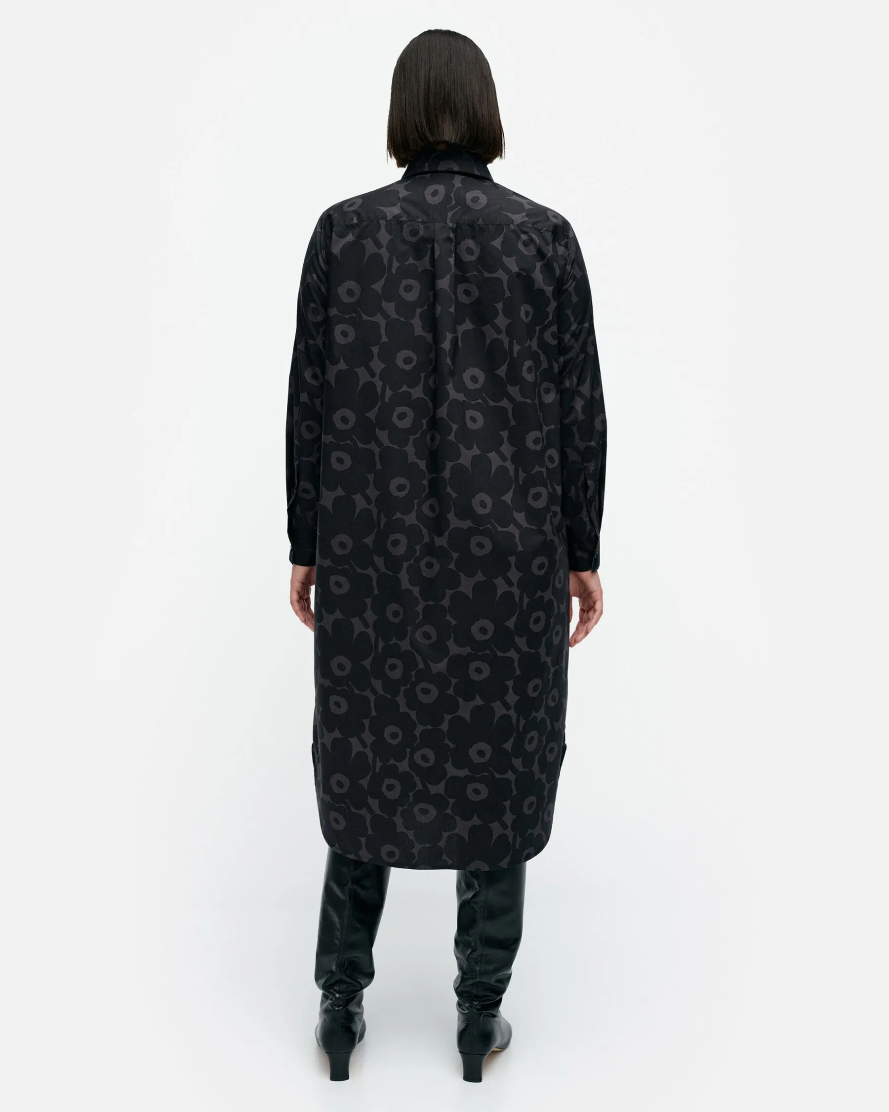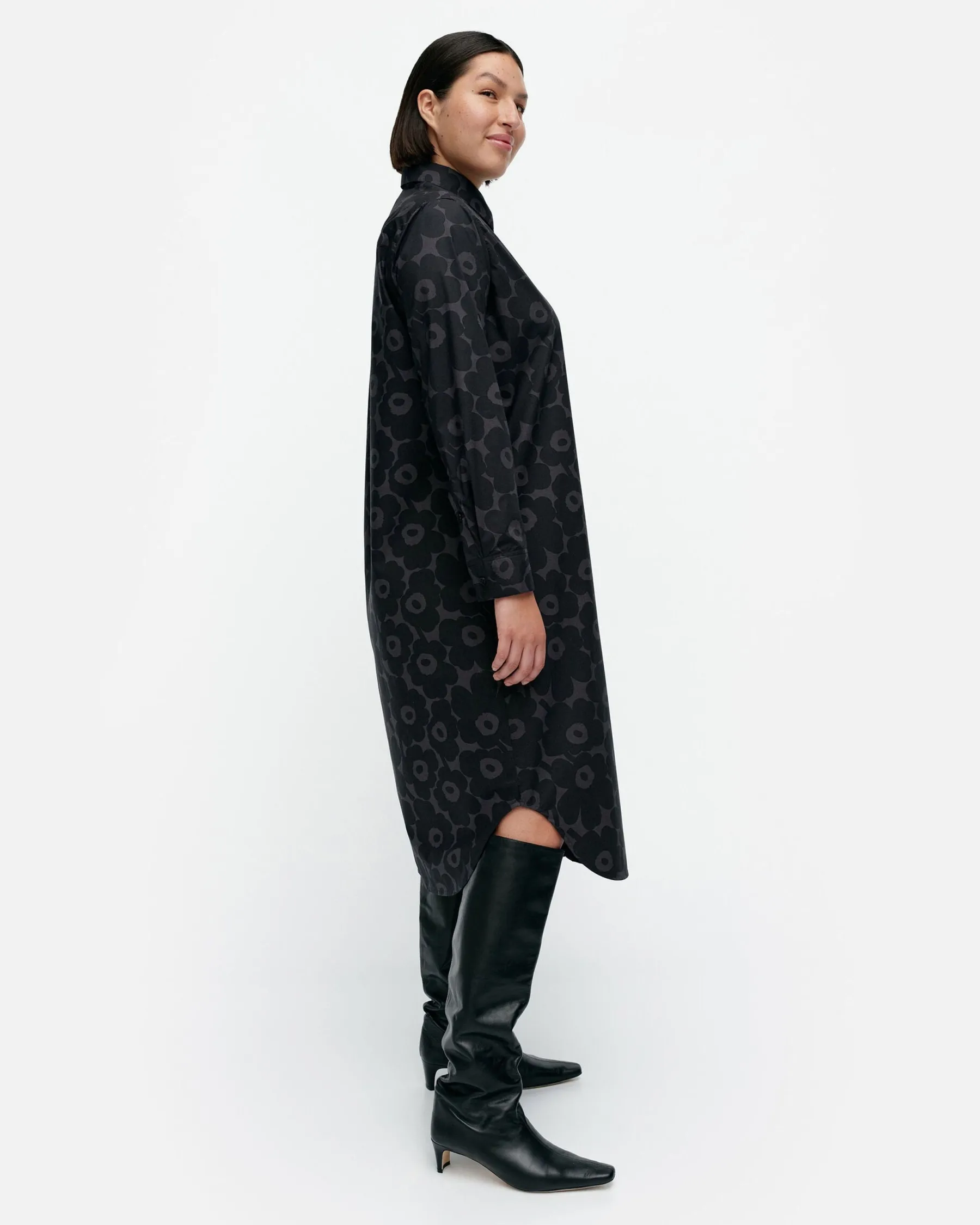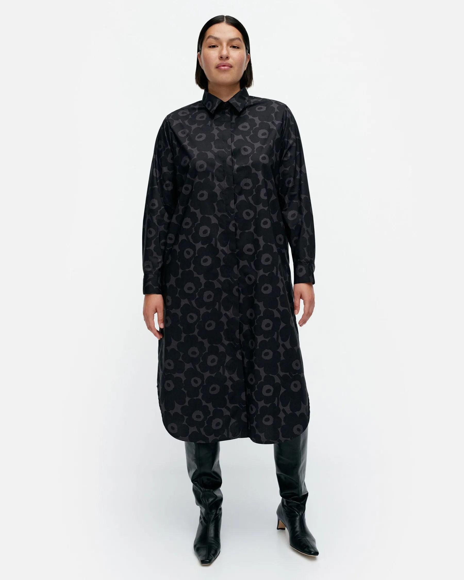 Askare-Paitamekko On Valmistettu Luomupuuvillapopliinista Ja Siinä On Niukka Istuvuus, A-Linjainen Leikkaus Sekä Mini Unikko -Kuosi. Mekossa On Paitakaulukset, Piilonappisuljenta Ja Sivusaumataskut. Hihansuissa On Napitettavat Mansetit Ja Helmassa On Pyöristetty Leikkaus.