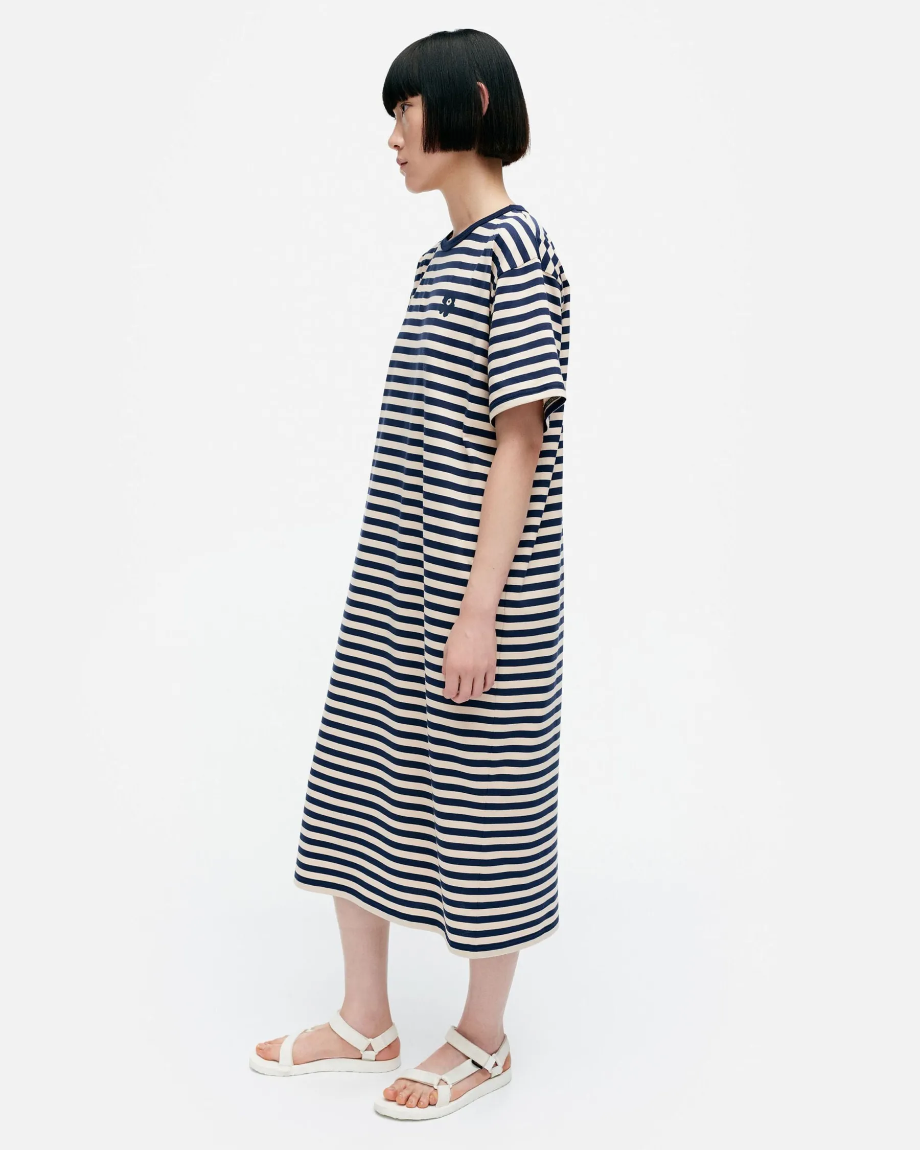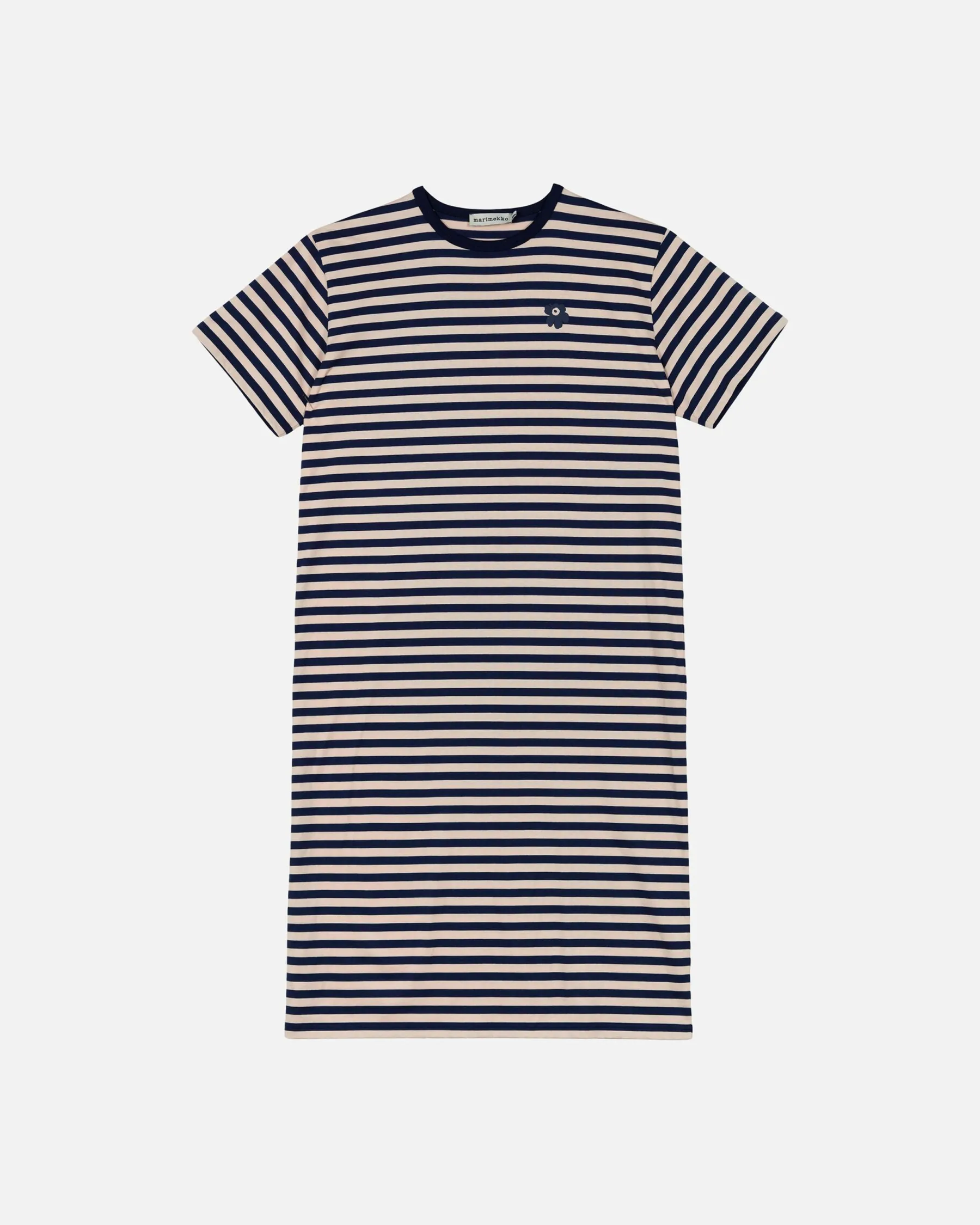Oversized-T-Paita-Mekko On Valmistettu Puuvillatrikoosta Ja Siinä On Väljä Istuvuus. Mekossa On Tasaraita-Kuosi Ja Rintaan On Painettu Pieni Unikko-Kuosin Kukka. Pyöreä Pääntie On Viimeistelty Resorilla.
