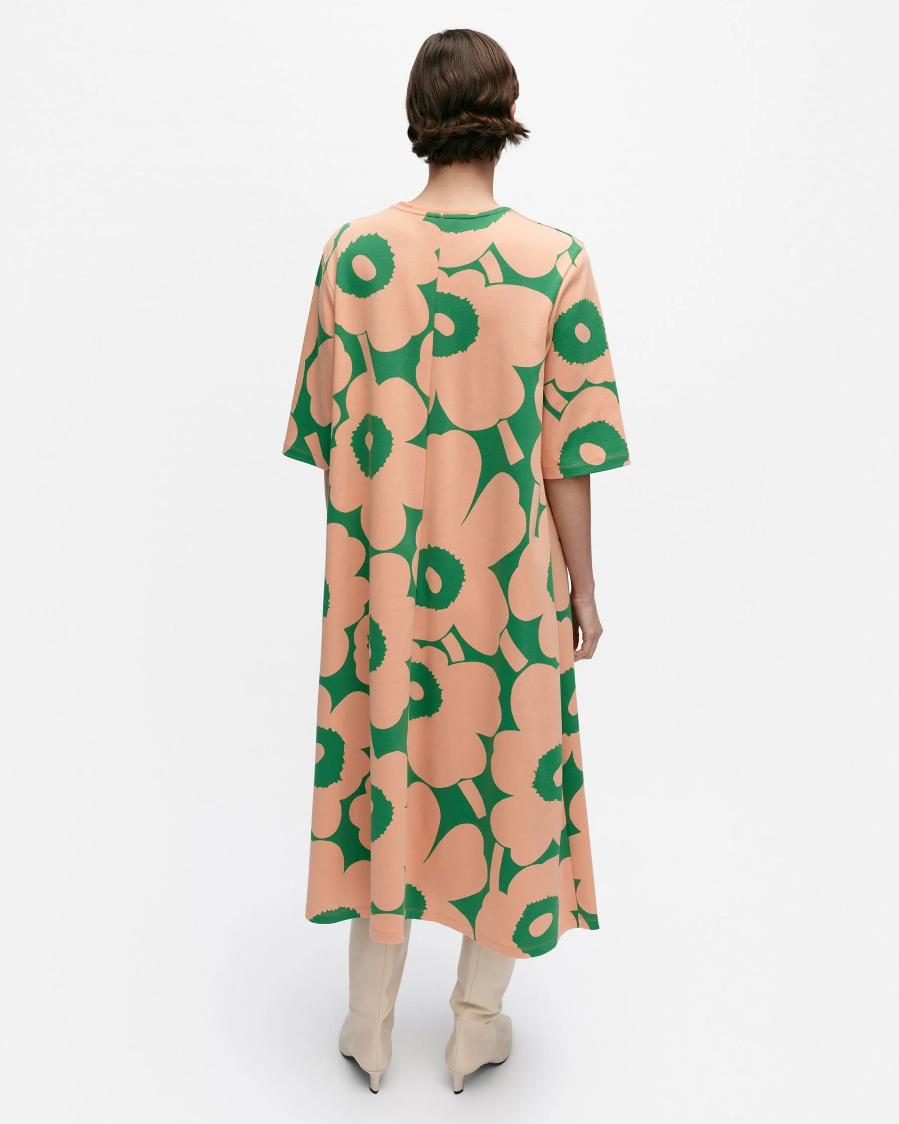 Tangentti-Puuvillatrikoomekossa On Rento Istuvuus, A-Linjainen Leikkaus Ja Unikko-Kuosi. Mekossa On Kapea Resori Pyöreässä Pääntiessä Ja Väljät Kyynärmittaiset Hihat.