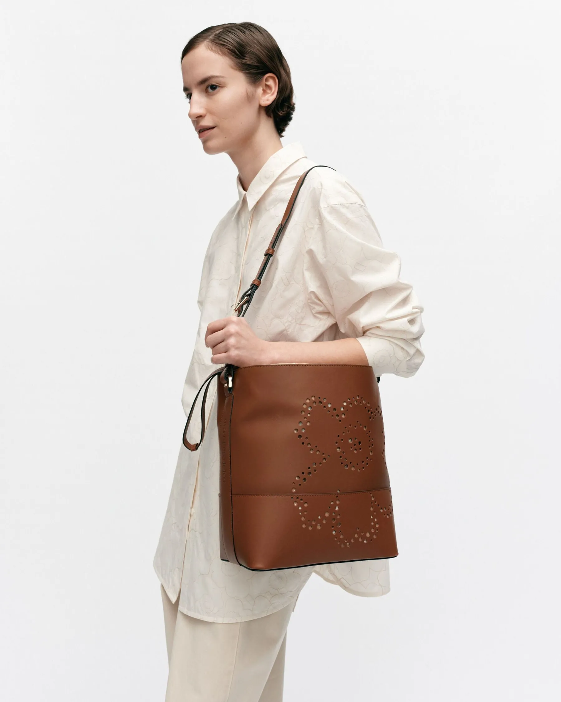 Imprint Tote Unikko -Laukku On Valmistettu Jäljitettävästä Skandinaavisesta Nahasta. Etupuolen Unikko-Kukka Muodostuu Pitsimäisesti Pienistä Rei’Istä. Laukussa On Säädettävä Olkahihna. Laukun Suuaukko Vedetään Kiinni Nahkahihnojen Avulla Ja Kiinnitetään Stopparilla. Laukussa On Yksi Sisätasku. Sisävuori On Valmistettu Unikko-Kuosisesta Puuvillasta. Marimekko-Logo On Kohokuvioitu Laukun Sivuihin Ja Pohjaan.