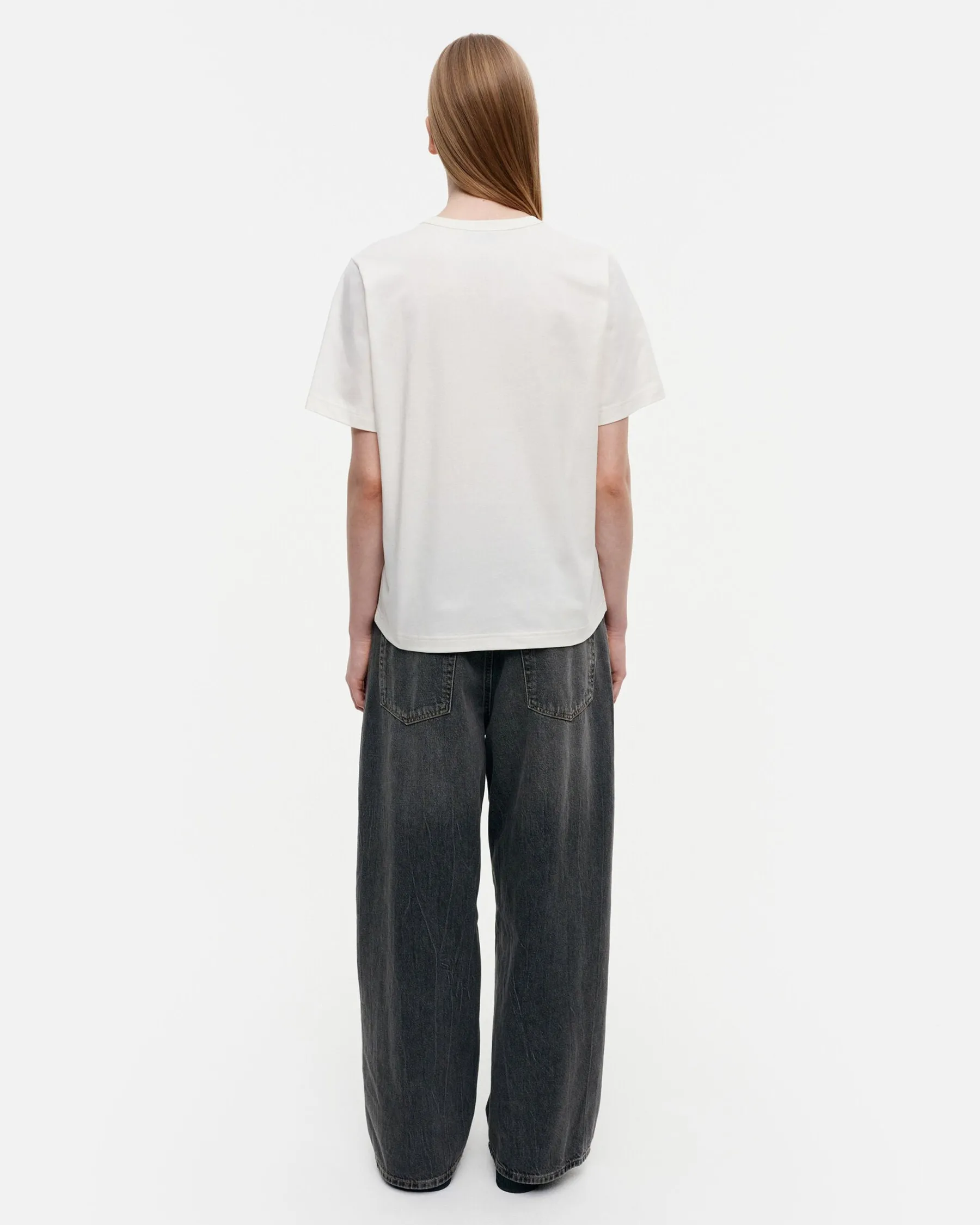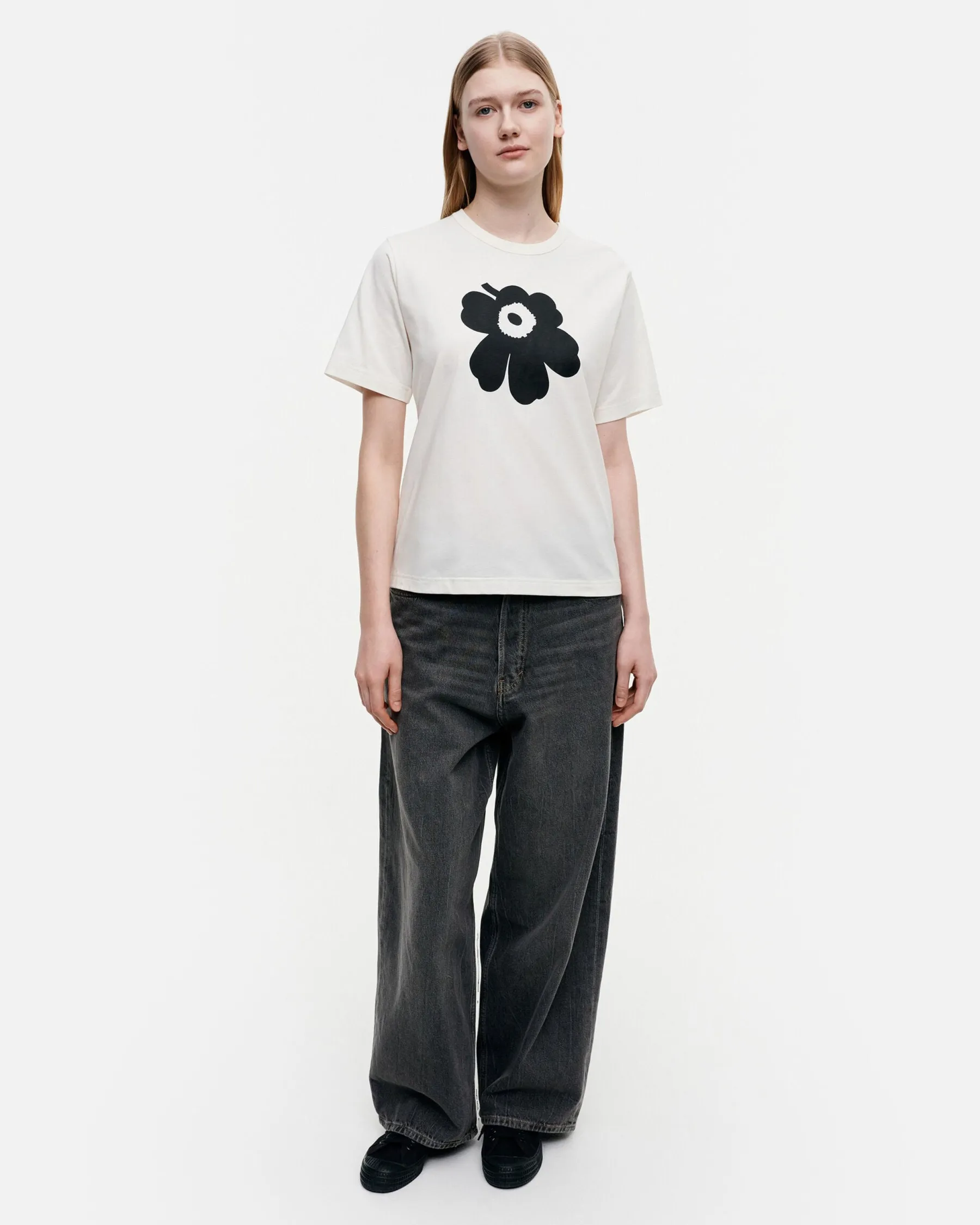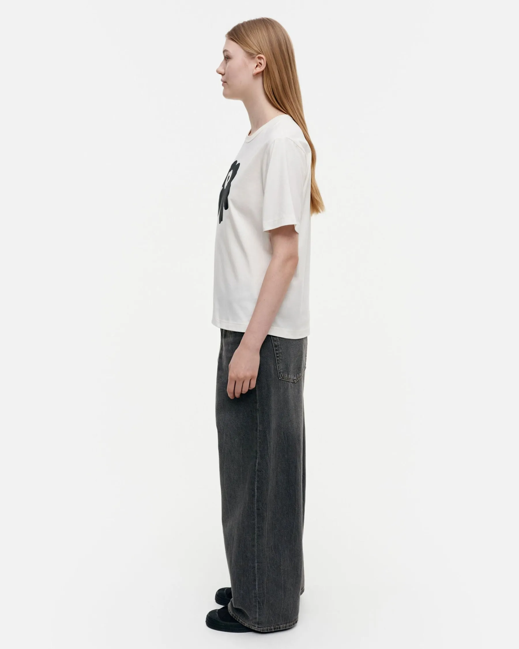 Luomupuuvillatrikoosta Valmistetussa Erna-T-Paidassa On Rento Istuvuus Ja Etupuolella Suuri Painettu Unikko-Kukka.Koko & Istuvuus