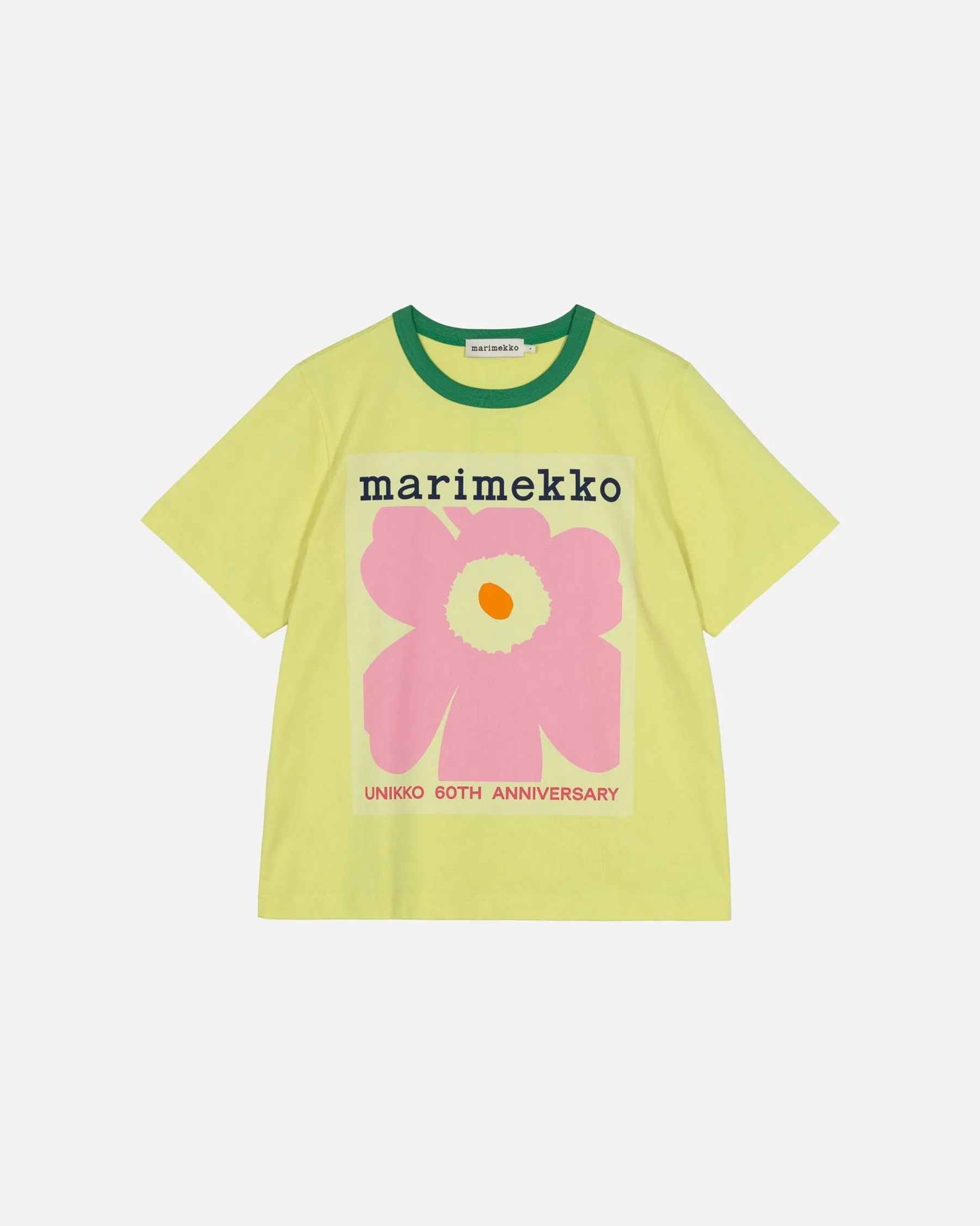 Erna-T-Paita On Valmistettu Luomupuuvillatrikoosta Ja Siinä On Rento Istuvuus. T-Paidassa On Suuri Unikon 60-Vuotisjuhlavuosiprintti Etupuolella Ja Resori Pyöreässä Pääntiessä.