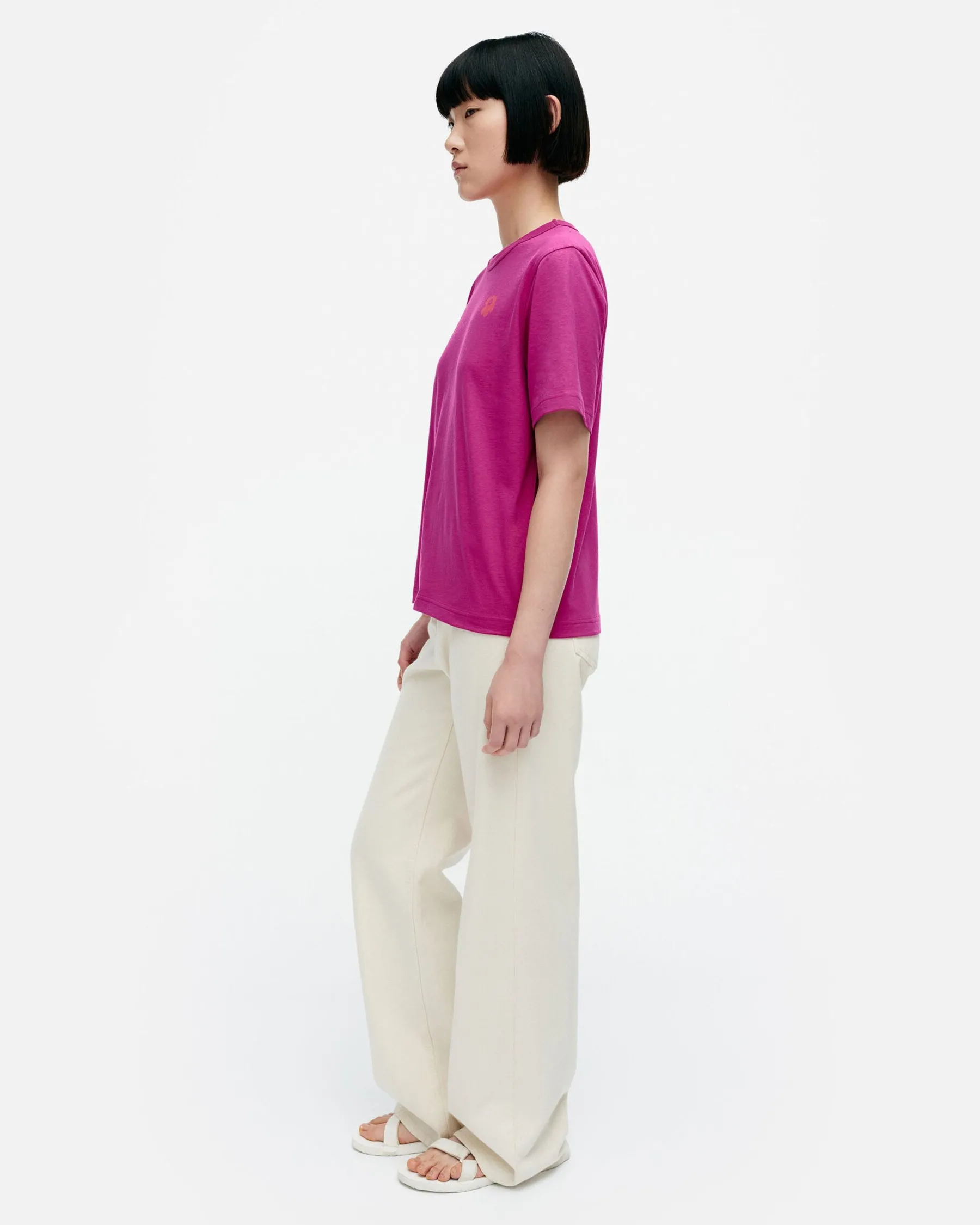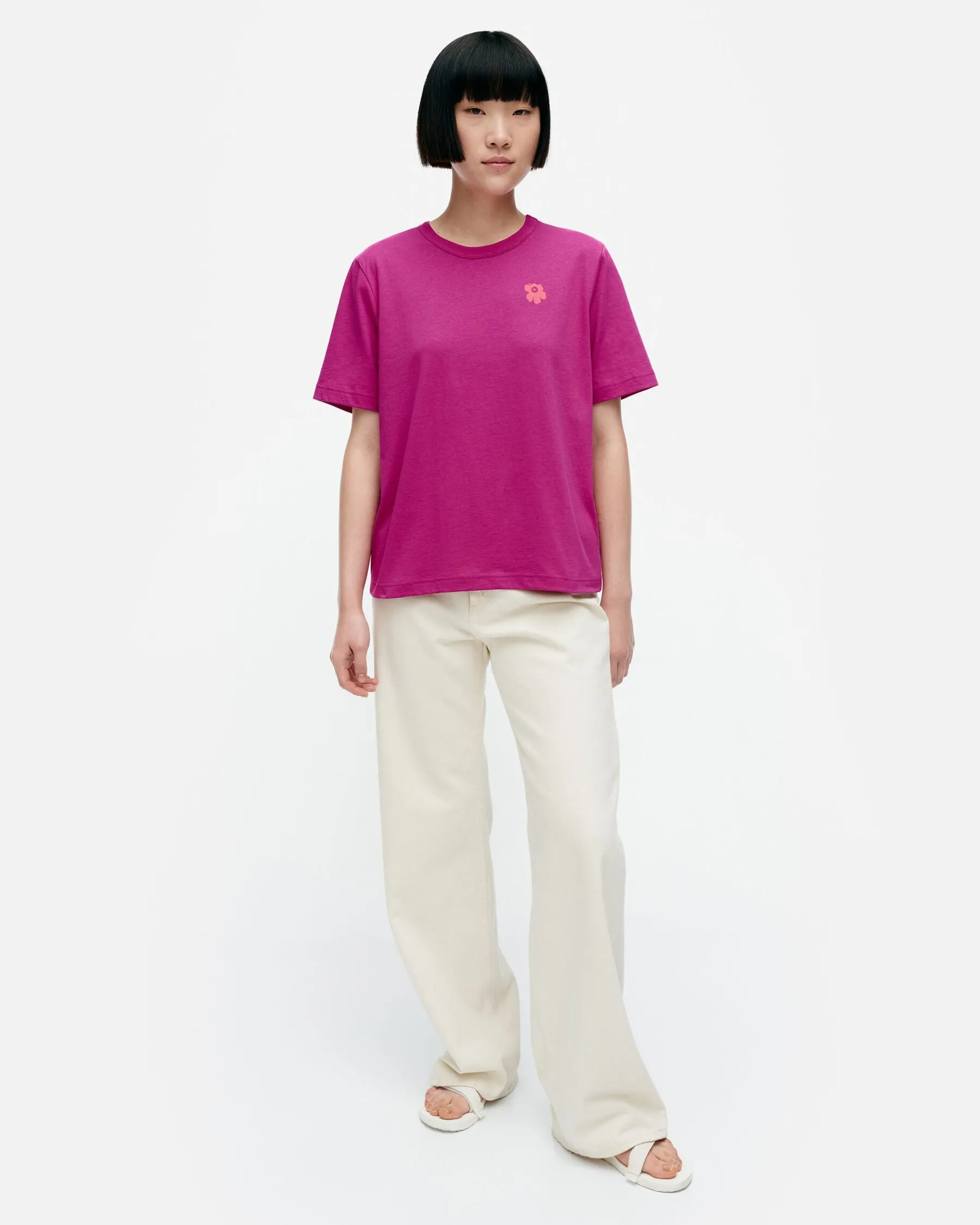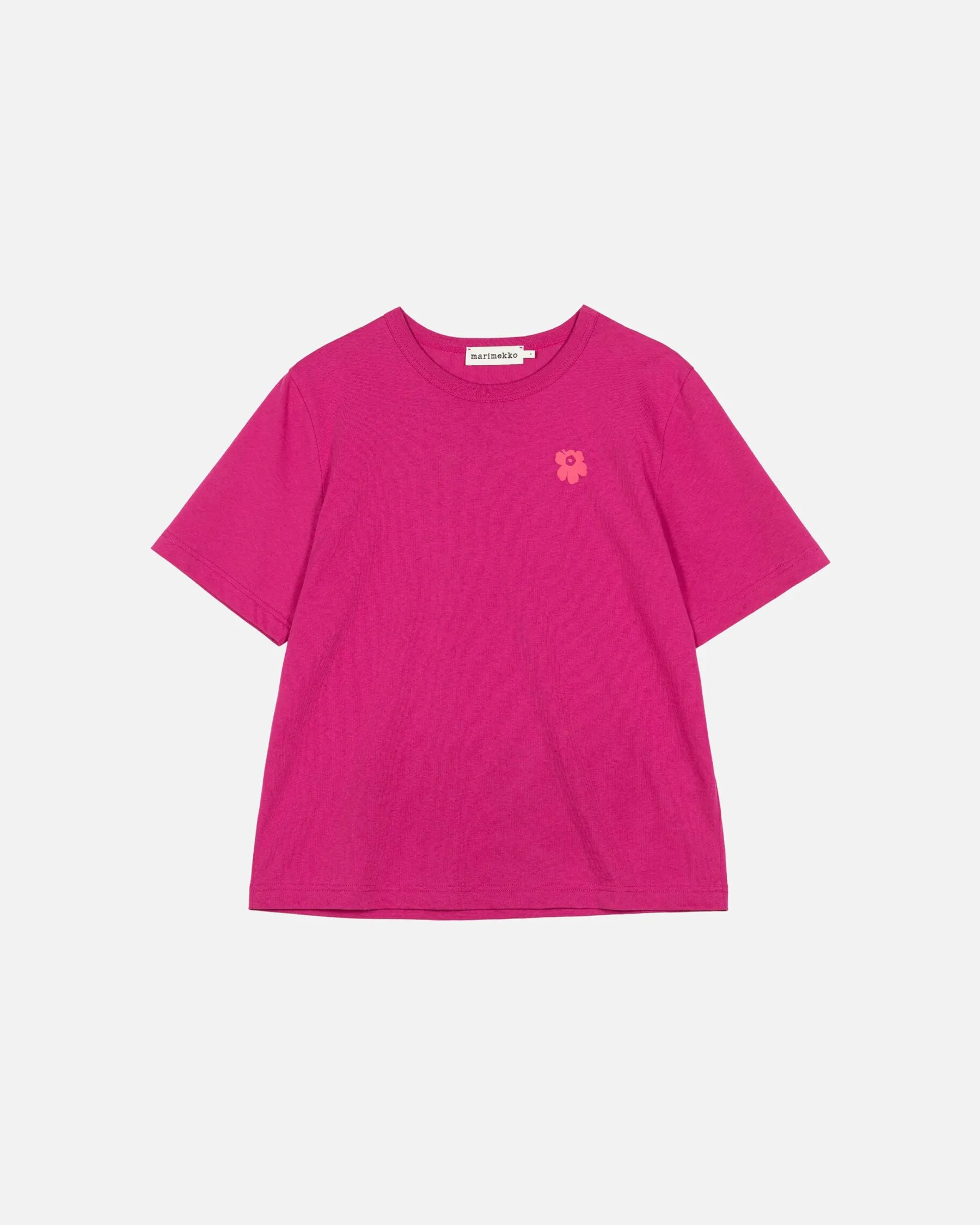 Puuvillatrikoosta Valmistetussa Erna-T-Paidassa On Rento Istuvuus Ja Etupuolella Kappalepainettu Unikko-Kuosin Kukka. Tuotteen Sisältämästä Puuvillasta 25 Prosenttia On Peräisin Marimekon Trikootuotteiden Valmistuksessa Syntyneestä Hukkamateriaalista.