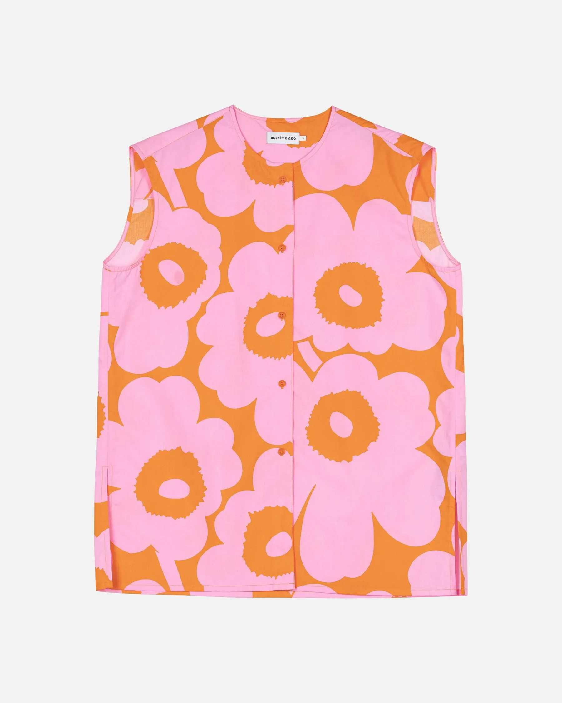Unikko-Kuosinen Pudas-Tunika On Valmistettu Luomupuuvillapopliinista Ja Siinä On Väljä Istuvuus Sekä Suora Leikkaus. Tunikassa On Pyöreä Pääntie, Lyhyet Holkkihihat Ja Nappisuljenta Edessä. Selkäpuolella On Kaarrokesauma Ja Laskokset Ja Helmassa On Sivuhalkiot. Kangas On Painettu Helsingissä.