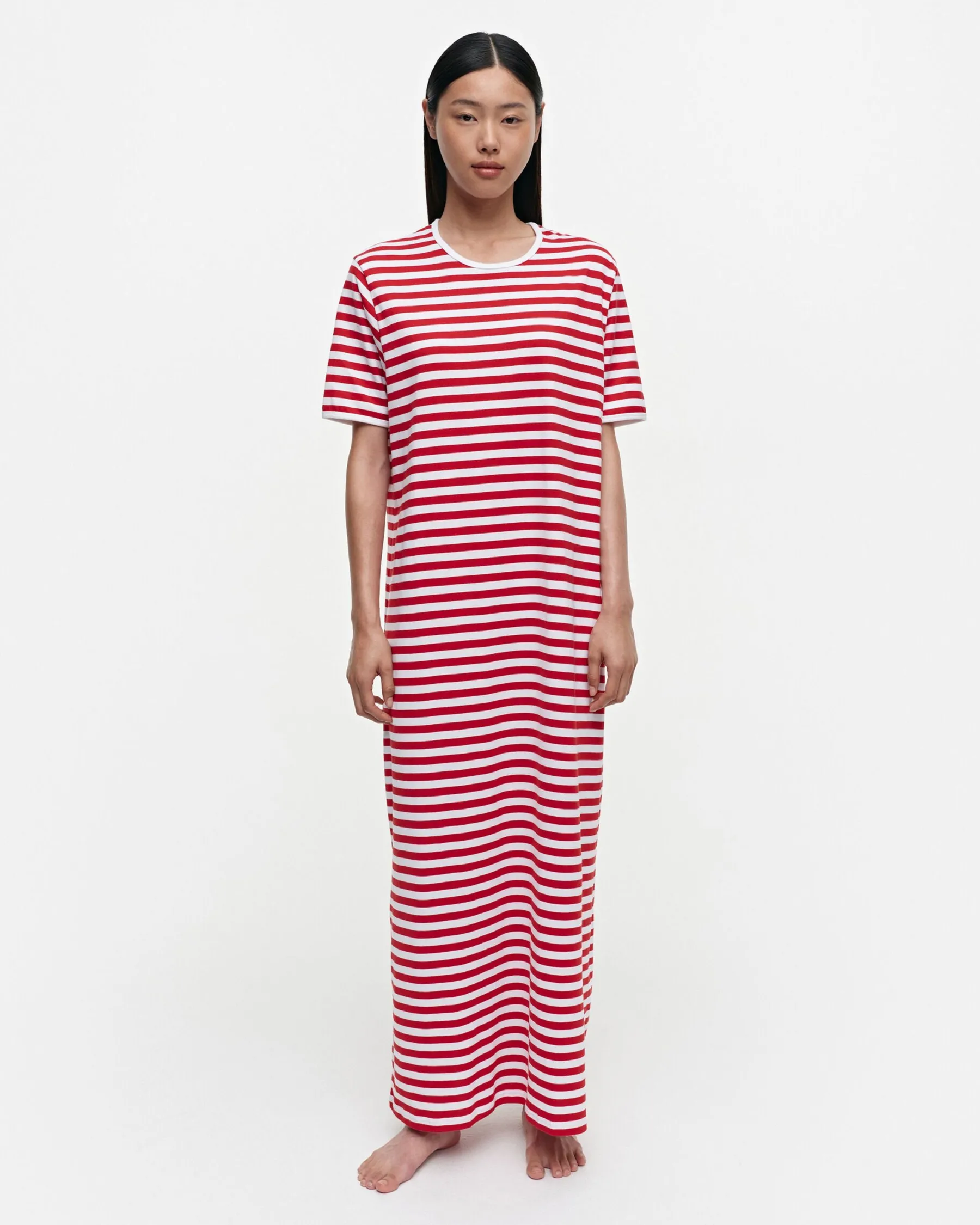 Puuvillatrikooyöpaidan Kuosina On Mustavalkoinen Tasaraita. Pääntiessä Ja Hihansuissa On Kanttaus, Ja Rennon Suora Leikkaus Laskeutuu Nilkkapituiseen Helmaan.